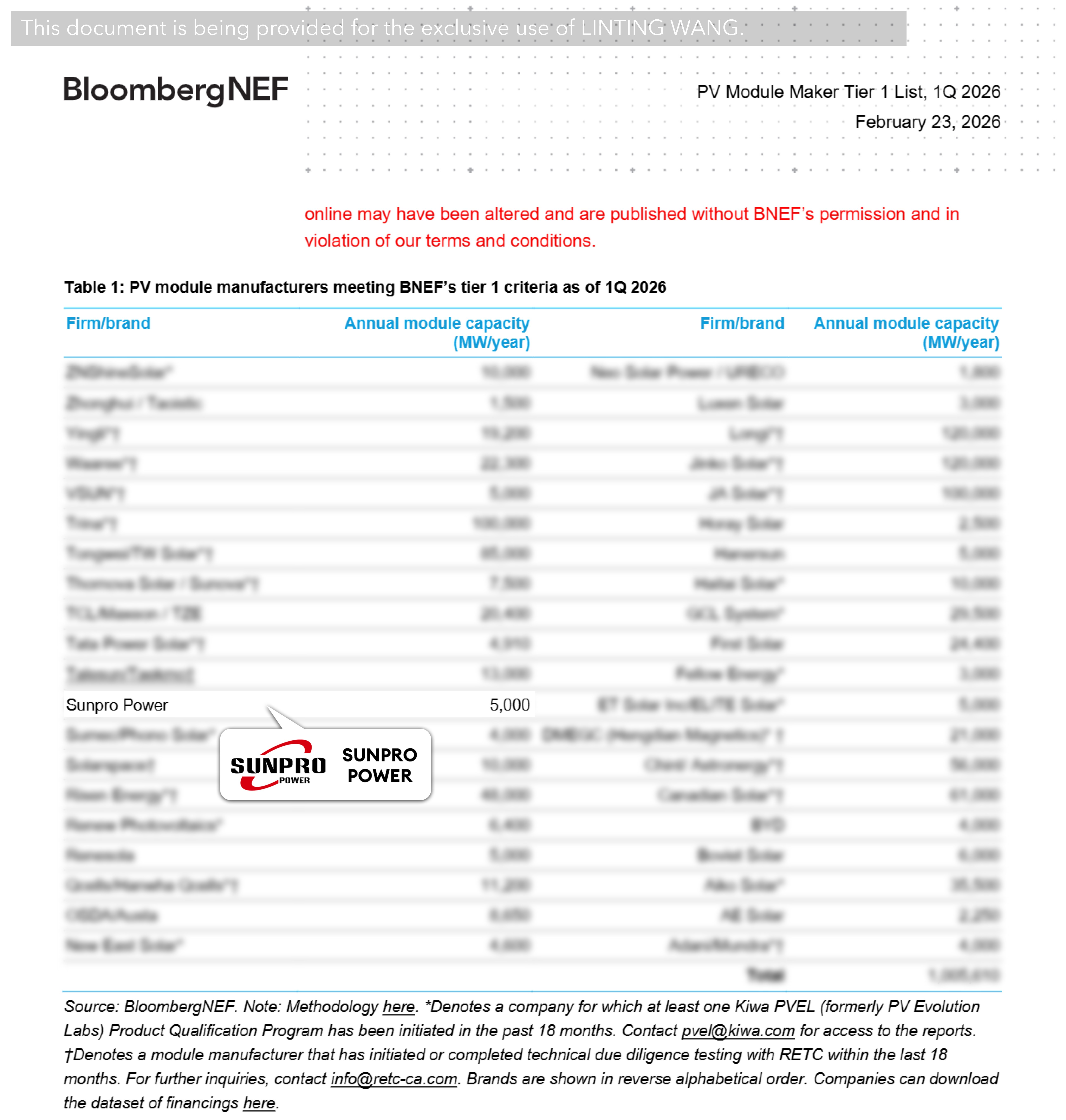 近日,彭博新能源财经(BloombergNEF)发布2026年第一季度“全球光伏组件厂商分级”名录,尚博能源Sunpro Power凭借持续领先的技术实力、稳健的全球交付能力及卓越的可融资表现,再次荣登一级光伏组件制造商(Tier 1)榜单。这已是公司连续第五年稳居该权威榜单。
