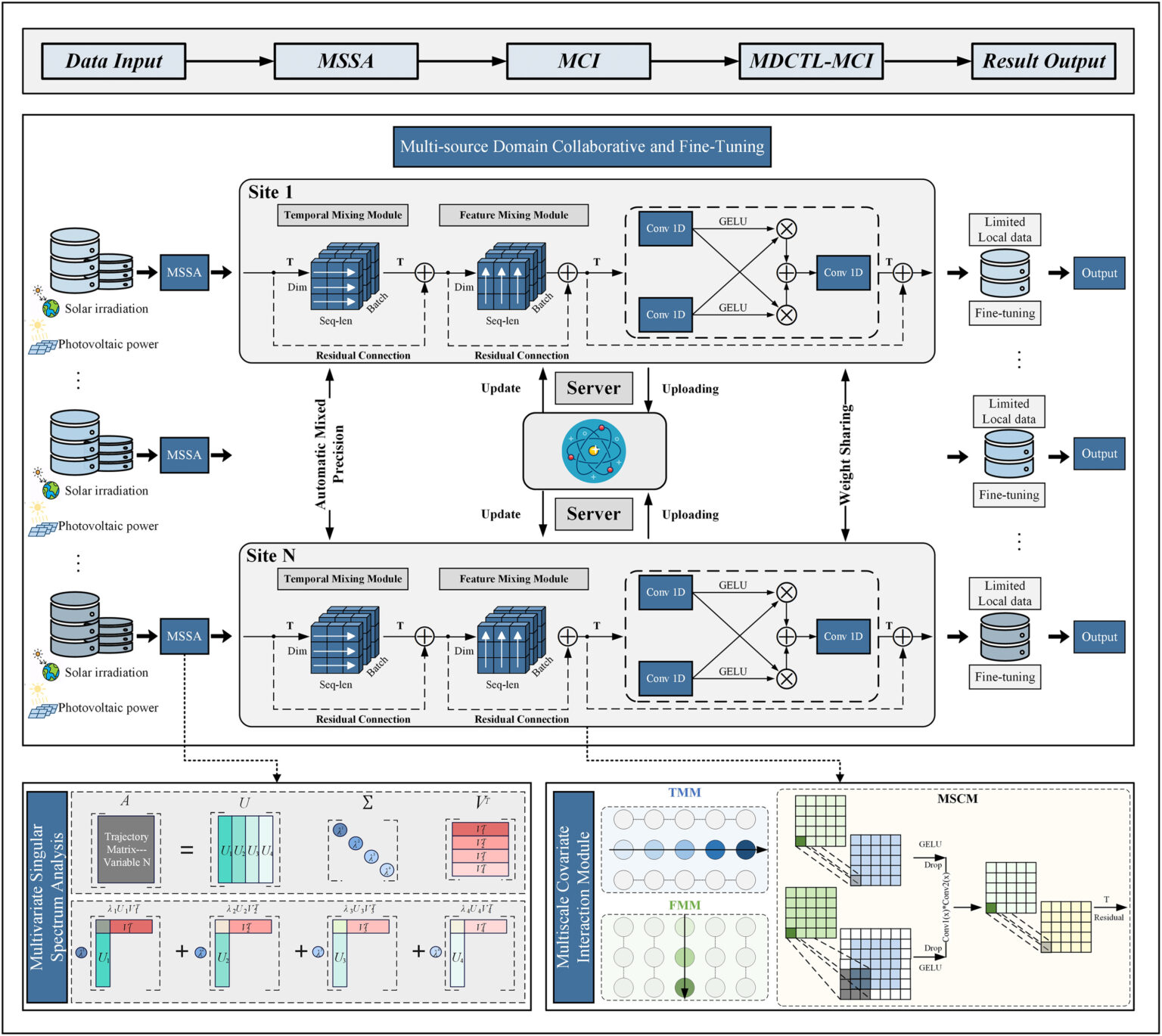 该方法创新性地融合了四大技术模块:首先采用多元奇异谱分析(MSSA)进行数据降噪和特征增强;随后通过轻量化多尺度协变量交互模型挖掘变量间的深层时序关联;进而利用多域协同迁移学习技术,整合多个光伏电站的数据提升模型鲁棒性;最后引入SHAP可解释性分析识别关键影响因素。