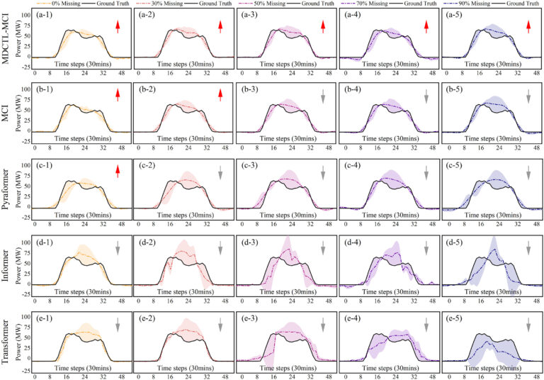 研究团队选取了中国北方、中部和西北地区四座光伏电站的全年运行数据(容量30-130MW),这些数据以30分钟为间隔记录,其中辐照度和气象等关键协变量缺失率最高达80%。在与Pyraformer、Transformer等九种先进预测模型的对比实验中,该方法的预测精度在完整数据条件下提升10.5%,在不同缺失数据场景下更是显著提升15.3%。